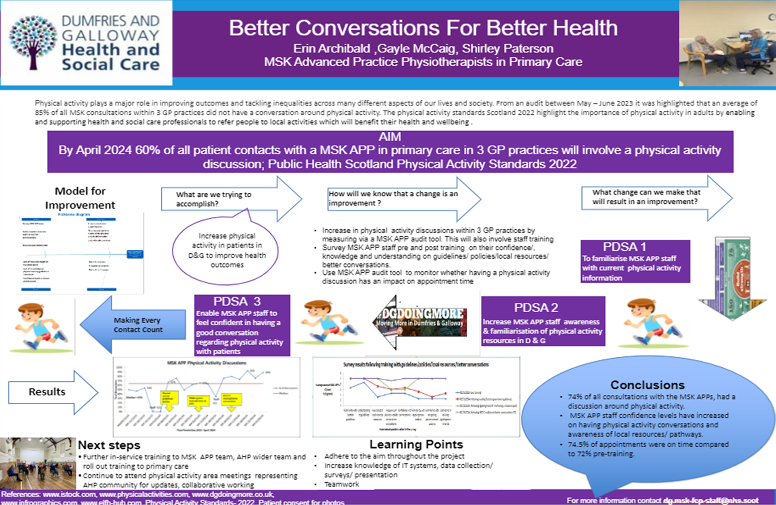 This poster presents Better Conversations for Health, a Dumfries and Galloway improvement project supporting MSK primary care teams to make physical activity a routine part of care. It highlights how increasing the number of positive, meaningful conversations between professionals and patients—focused on small, realistic and achievable changes—can help more people move more, feel better, and improve their long‑term health and wellbeing. The poster also outlines how a Plan–Do–Study–Act (PDSA) approach was used to test and refine what works best in everyday healthcare conversations.